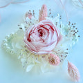 Featuring a preserved blush pink garden rose as the focal point, accented with airy white hydrangeas and delicate foliage, this design offers gentle texture and natural elegance. Thoughtfully handcrafted to feel light and comfortable on the wrist, it adds a refined floral accent perfect for romantic and garden-inspired wedding celebrations.
