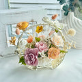 This preserved flower arrangement is lovingly styled in a white woven basket with a delicate lace bow, featuring a pastel palette of lavender rose, peach pink, buttery yellow, and creamy neutrals. With playful textures and a garden-inspired feel, it's the perfect gift for someone who loves gentle colors and natural whimsy.